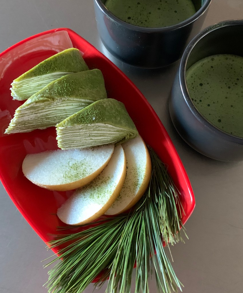The morning after Christmas, we enjoyed our matcha accompanied by Matcha Mille (a thousand leaves) Crepe Cake.I ventured into making foods with culinary matcha and discovered the cake’s wonderful recipe in justonecookbook. I was concerned the tea and the cake would be matcha overload, but no, the cake’s subtle flavor and taste, along with Asian Pear slices, complemented the tea perfectly!