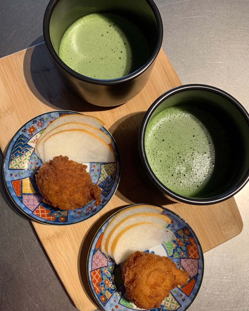 Often served during New Year’s celebration, these delicate donuts (made by my niece, Lisa Rowland), are light, fluffy, and a lovely accompaniment to the matcha along with sliced Asian pears.