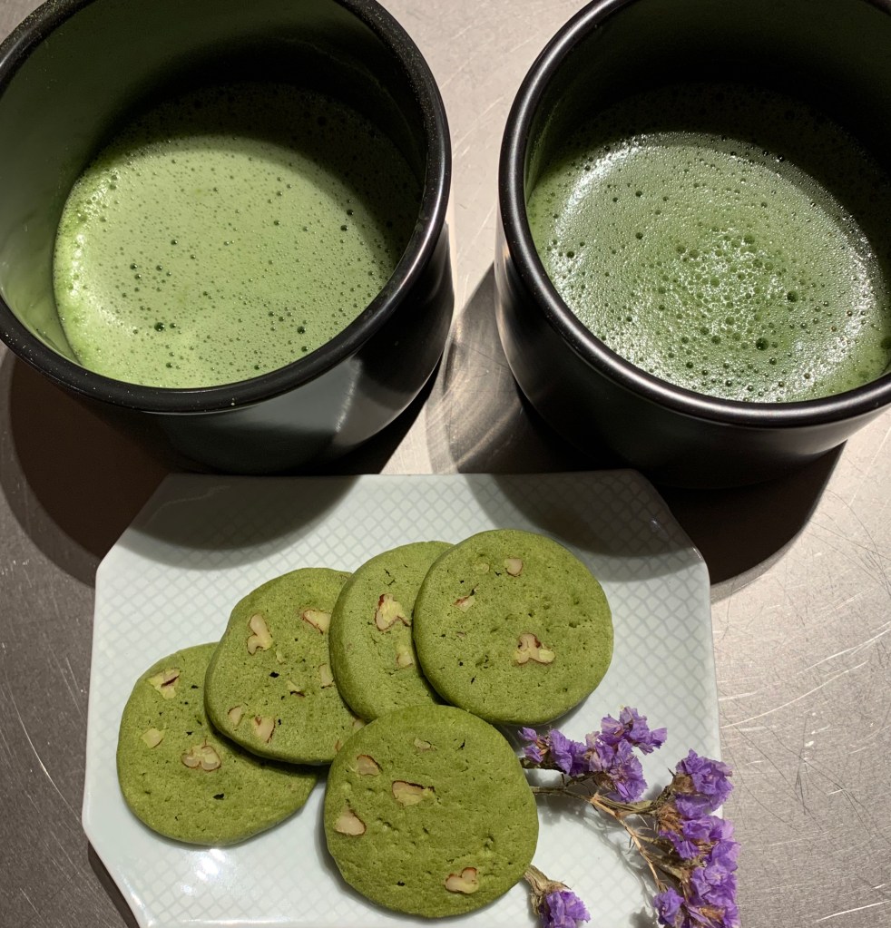 I prepare a bowl of hot matcha every morning for my husband and myself–it took a bit of time to develop a taste for this tea, but our perseverance was well worth the effort. With its frothy, smooth, and mellow fragrance and taste, we also love matcha’s abundance of health benefits such as concentrated amounts of antioxidants, catechin which is thought to inhibit the growth of cancer cells, and heart healthy attributes. Matcha consists of high-grade green tea leaves ground to a fine powder (I call it magic tea dust!) so when drinking it, one ingests the leaves themselves and all its nutritional benefits. My palate’s inclination leans toward the savory than sweet, but it’s always nice to have a little sweet something with matcha. Here, matcha is served with chocolate chip and pecans tea crisps.